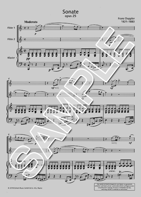 A.アドリアン氏が『ドップラーの発見』と題して話題を呼んだCD(CDID : 7871)に収録されている、新発見のソナタです。バイエルン国立図書館の「ショット社歴史的出版物アーカイヴ」所蔵の作曲家の自筆手稿譜を基に校訂編集し、出版しました。全4楽章から構成され、第1楽章 Moderato 4/4 [C] ではオクターヴ跳躍する付点音符の動機が交互に模倣され、技巧的楽句に展開されます。次の主題は転調を重ねて付点音符楽句が華麗に舞い、やがて3連符が変奏曲風に激しく躍動しながら飛び交う超技巧的二重奏となります。第2楽章 Menuetto 3/4 [a] は軽妙に、また悲しげに踊られます。続くトリオ [F] は優美でワルツ風に楽しく踊られます。第3楽章のAndanteと第4楽章のRondoは、従来から親しまれている「アンダンテとロンド」で、ソナタの後半を形成します。(解説/佐野悦郎)スタッフより