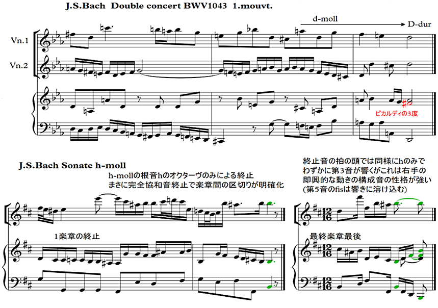 前出の「倍音列構成音は協和音」という原理からすると例えばC-durの主和音C、E、Gは根音の倍音列の低次倍音列の構成音だがc-mollではC、Es、Gとなり根音Cの倍音列にはないEsが入る事になり安定した響きにはならないと考える。バッハや他のバロックの作曲家たちは感覚的にそれを感じていたのだろう。特にバッハにおいては短調の曲の終止において、例えばそれが終曲である場合や次の楽章(大抵は長調)とのハッキリした切り離しを考えている場合、最後の和音の第3音を半音上げて長調にする、いわゆるピカルディの3度を使用することが多い。ピカルディを使わない場合は第3音(と第5音)を抜いてオクターヴで終止する。そうすれば完全協和音の安定した響きが得られる。