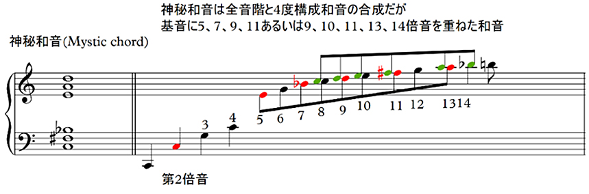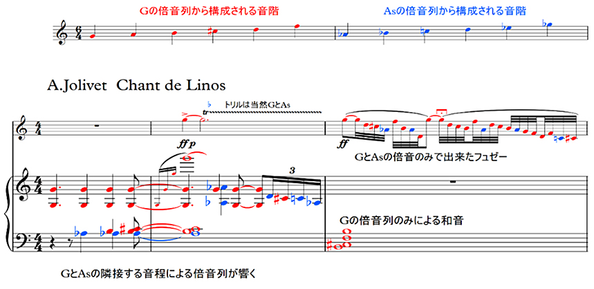 隣接する低音(半音程)が同時に響いた時に、その上にそれぞれの倍音列に含まれる音を混合して鳴らすという手法。典型的な例が「リノスの歌」で、最初の部分の音の全てはピアノのバスのGとAsの倍音のみで書かれている。全てが一体化した協和音状態なのでその中で動くフルートの速いパッセージは必然的に32分音符の高速フュゼーの必要性があり、カデンツァ風にゆっくりから動くなんて演奏は作曲の意図とは全くかけ離れている。