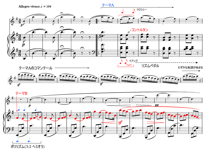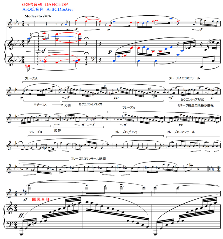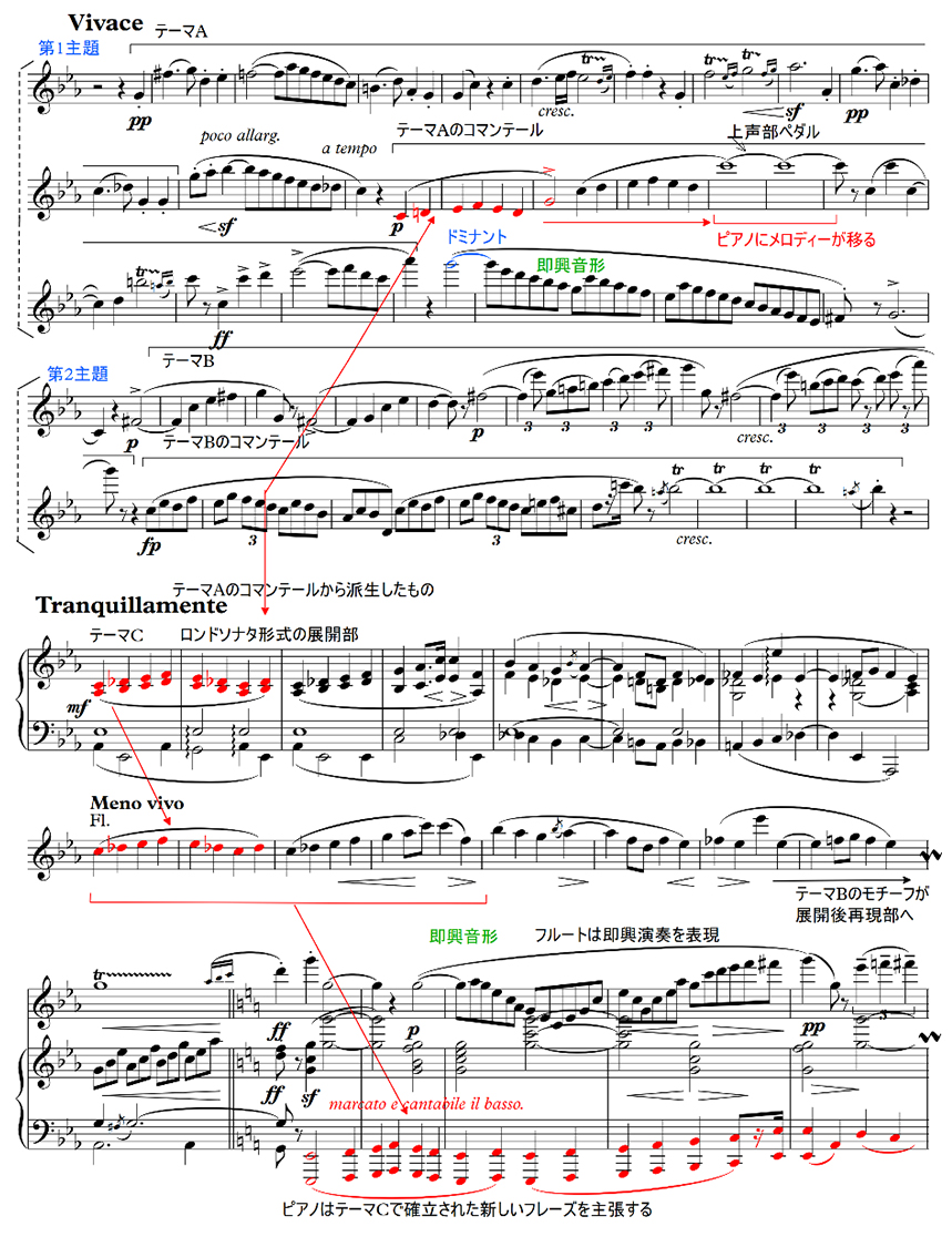 構成上は一見4楽章ソナタに見えるが各曲の形式は様々で、全体としてソナタの形態には当てはまらない。特徴的なのは第1曲のモデラートが4分の2拍子、第2曲のスケルツォが8分の3拍子で、両方ともアナクルーズから始まる前奏部分を持つ。この拍子の関係とアナクルーズによるつながりは、J.S.バッハにおける組曲のアルマンドとクーラントの関係そのものである。そうするとロマンスはテンポ的にはサラバンドに相当するようではあるが、これはベートーヴェン以後よく使われてきたいわゆる「ロマンス」と考えられる。4曲目もFinalという題名がふさわしいだろう。これまでフルート名曲♪研究所で扱ってきたパリ音楽院卒業試験課題曲と違うのは多声部による対位法が使われている点。これによって違うメロディーがフルートと並行して一緒に動いたり、3度音程で重なっていたり、フルートが伴奏にまわったりという様な、他声部とのアンサンブルの要素が強くなっている。