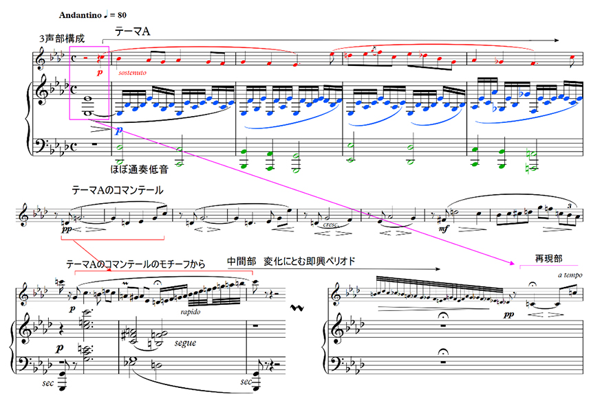 何と言っても印象的なのが曲の冒頭の短い前奏、特にピアノの右手の高い音域でのオクターヴが魅力的に響く。この部分パッと見にはリノスの冒頭と譜面的に似ている。ジョリヴェのドゥーブル・バスは、あくまでバスの響きとその上声部の関係なのだが、このピアノの右手をドゥーブル・バスと見なせば高い音程の倍音では同じ様な関係が当てはまる。この印象的な響きはしばらく頭の中で響き続ける感覚がある。これに続くテーマのメロディーはロマン派的な普通のメロディーラインだが、このメロディーを含め、ピアノ右手の内声の16分音符も全ての音がAsとGの倍音に相当(5小節1拍目のウラにDesが出てきてここで転調するまで)する。そのためかなり自由な動きの内声音形もごく自然に響きの中に安定して溶け込む。オルガニストとして複雑な倍音の中に生きた作曲家の独特な感性であり、ジョリヴェのドゥーブル・バスより70年も前に感覚的に導き出した作曲技法である。構成としては基本的にセクエンツィア形式で、フレーズは2回繰り返される。