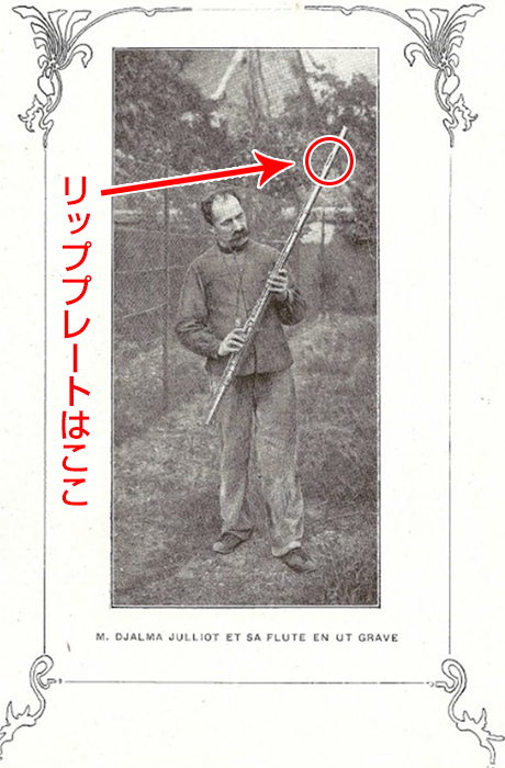 斬新で面白いのだが、私の個人的な意見は、この時代にこんな複雑なメカをつくって、だれが調整するの?というのと、アメリカでの特許項目の中にある面白いが絶対NGなのがソルダードのトーンホールが管体の中に突き抜けるようになっている点。説明によれば管内部の水滴がパッドに溜まらない(突き抜けたトーンホールのふちに沿って水滴は下に流れて行くから)という構造だが「中を掃除するとき布がひっかかるだろ!!」という特許内容もあった(ひょっとするとこの時代に管内部は掃除しなかったのかもしれない???) 。他にも様々なタイプのフルートを作っていたメーカーで、Des管のラインナップもあり、これはヴィドールの対談の回で話したイギリスのハイピッチ問題に対処したものと思われる。またEs管の「3度フルート」(Flûte tierce/Flûte en mi♭)という小ぶりなフルートも作っていた(ラテン・ジャズ用)。バスフルートはU字管の物の他に「そのまんまバスフルート」、つまり1本の長くて太いフルートもあった(2人用ですか?)。これに関しては1900年の万博の資料に「ジャルマ・ジュリオが特許付の特大のメカニカルなバトンをタファネルにプレゼントした」という記述があり、この「つくってみたぞそのまんまバスフルート」はタファネルの手に渡ったのではないかと思う。