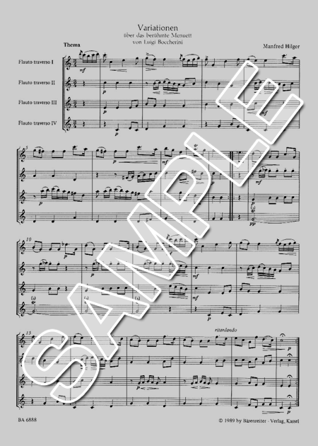 イタリアの古典派で室内楽の大家であるL.ボッケリーニ (1743-1805) の有名な弦楽四重奏曲 ホ長調 (op.11-No.5 [or op.13] ) の第3楽章の 『メヌエット』 の主題をもとにして、M.ヒルガー氏が 「4つの変奏曲・コーダ付き」 (難易度初〜中級) に仕立て上げた四重奏曲です。各変奏曲T〜Wとも変化に富み、その内容は演奏会用は勿論の事、アンサンブル教材にも最適です。この原曲が余りにも有名である事から、正直なところM.ヒルガー自身の作品であるか、または彼の編曲作品であるのか迷うところですが、結局、今回の紹介は原曲者のL.ボッケリーニの編曲作品としてご紹介させて頂きました。彼は弦楽室内楽の発展のために多くの功績を残しており、取り分け弦楽四重奏曲、五重奏曲の分野では重要作品が多く残されています。(解説/佐野悦郎)【終了】プレゼントキャンペーンは終了いたしました。たくさんのご利用、ありがとうございました。