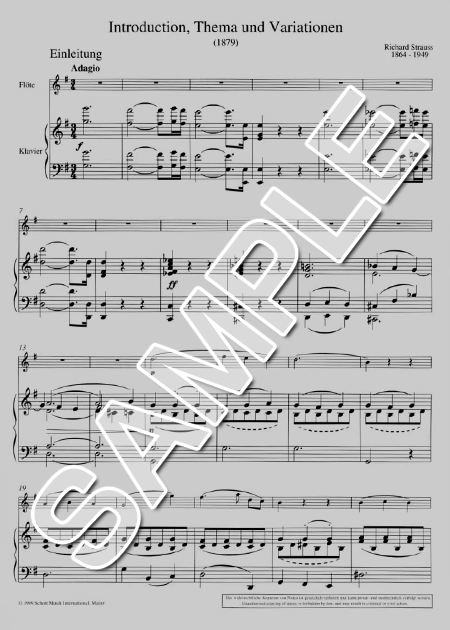 この曲は、後期ロマン派の作曲家、リヒャルト・シュトラウスの少年の時期の作品です。シュトラウス自身、生前には若い頃の作品の出版や演奏を認めず、存在のみ知られていた作品ですが、近年になって出版の運びになりました。父親がミュンヘン宮廷歌劇場首席ホルン奏者であったシュトラウスは、4歳の時から規則正しいピアノのレッスンを受け、6歳でピアノ曲や歌曲を作曲しました。父親の保守的な傾向を受けて、ハイドン、モーツァルト、ベートーヴェンに傾倒した幼少期でした。両親の意向で、一般的な教養を高めるため、1874~82年、ルートヴィヒ・ギムナジウムに進学したシュトラウスは、1877年、終生の友で後の作曲家、ルートヴィヒ・テュイレに出会いました。1897年、そのテュイレに宛てた手紙に、フルートの友人のために変奏曲を書いたと記しています。たぶん、学校の催しで演奏されたのでしょう。前年に父のために「ホルンのための序奏、主題と変奏曲」を作曲しているので、その延長線上に書かれた曲と言えましょう。G-durの序奏と主題、5つの変奏曲から成ります。後の大作曲家を想像しながら演奏すると、スケールの大きさの片鱗が感じられます。(解説/三上明子)ニュース