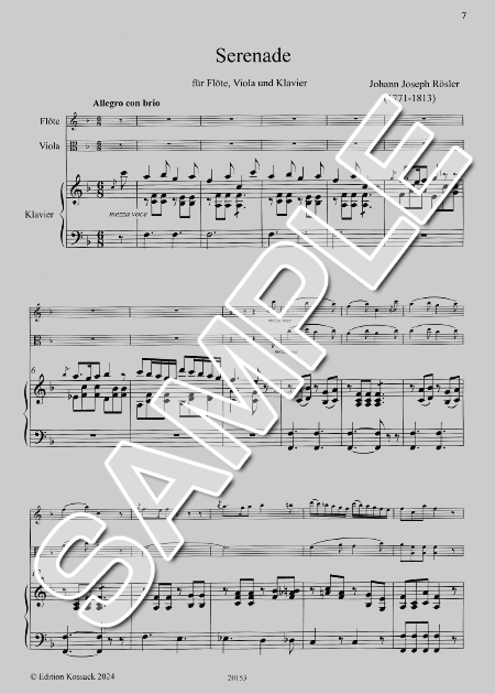 セレナーデは古典派様式の4楽章構成で書かれ、第1楽章 Allegro con brio(6/8)[F]はソナタ形式、第1主題[F]はのどかな牧歌的旋律をフルートとヴィオラが6度進行で奏で、第2主題[C]はピアノの伴奏上にワルツ旋律が踊られます。展開部では各楽器が対話を重ねます。第2楽章 Menuetto-Allegro vivace(3/4)[F-d-F]は複合三部形式で書かれ、最初にピアノが優雅なメヌエット主題を奏で、フルートとヴィオラが追って同旋律をユニゾンで奏でます。後半は各々に問答を繰り返し、トリオ[F-d-F]ではヴィオラが清らかな分散和音旋律を奏で、フルートが模倣します。第3楽章 Adagio(2/4)[B]はロマンの香り漂う充実したソナタ形式で書かれ、清らかなピアノの伴奏上に優美な付点音符の第1主題[B]をフルートが奏で、追ってヴィオラが寄り添います。第2主題[Des]は主題を交互に奏で、対話を重ねて大きく変化します。展開部は付点音符主題断片が激しく交錯し、荒波を形成します。第4楽章 Allegretto(3/4)[F]はロンド形式で、主題は軽妙な3拍子ポルカです。前半の挿入句[C]は短前打音で飾られた主題が愛らしく戯れます。後半の挿入楽句[B]は優美な音階旋律が舞い踊ります。J.J.レスラーは初期ロマン派に活躍したボヘミア生まれのピアニスト、作曲家、指揮者です。後にウィーン宮廷歌劇場管弦楽団等の楽長を歴任し、多くの室内楽作品を残しました。(解説/佐野悦郎)ニュース